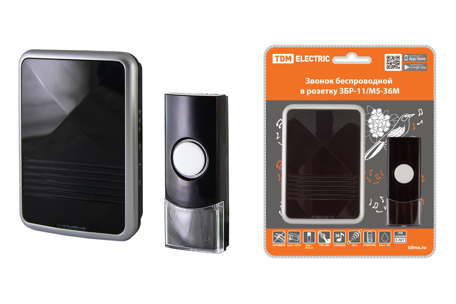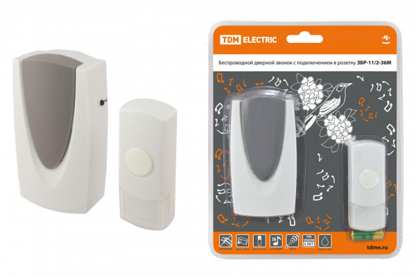 Звонок беспроводной в розетку ЗБР-11/М5-36М (кнопка IP44, AC 230В, многокодовый, 200 м) TDM /60